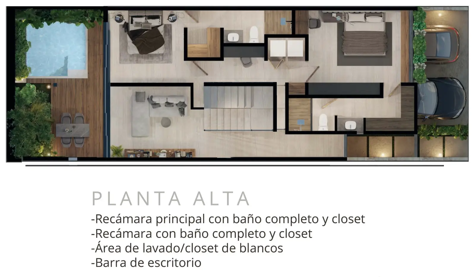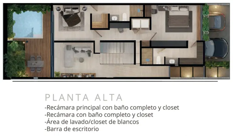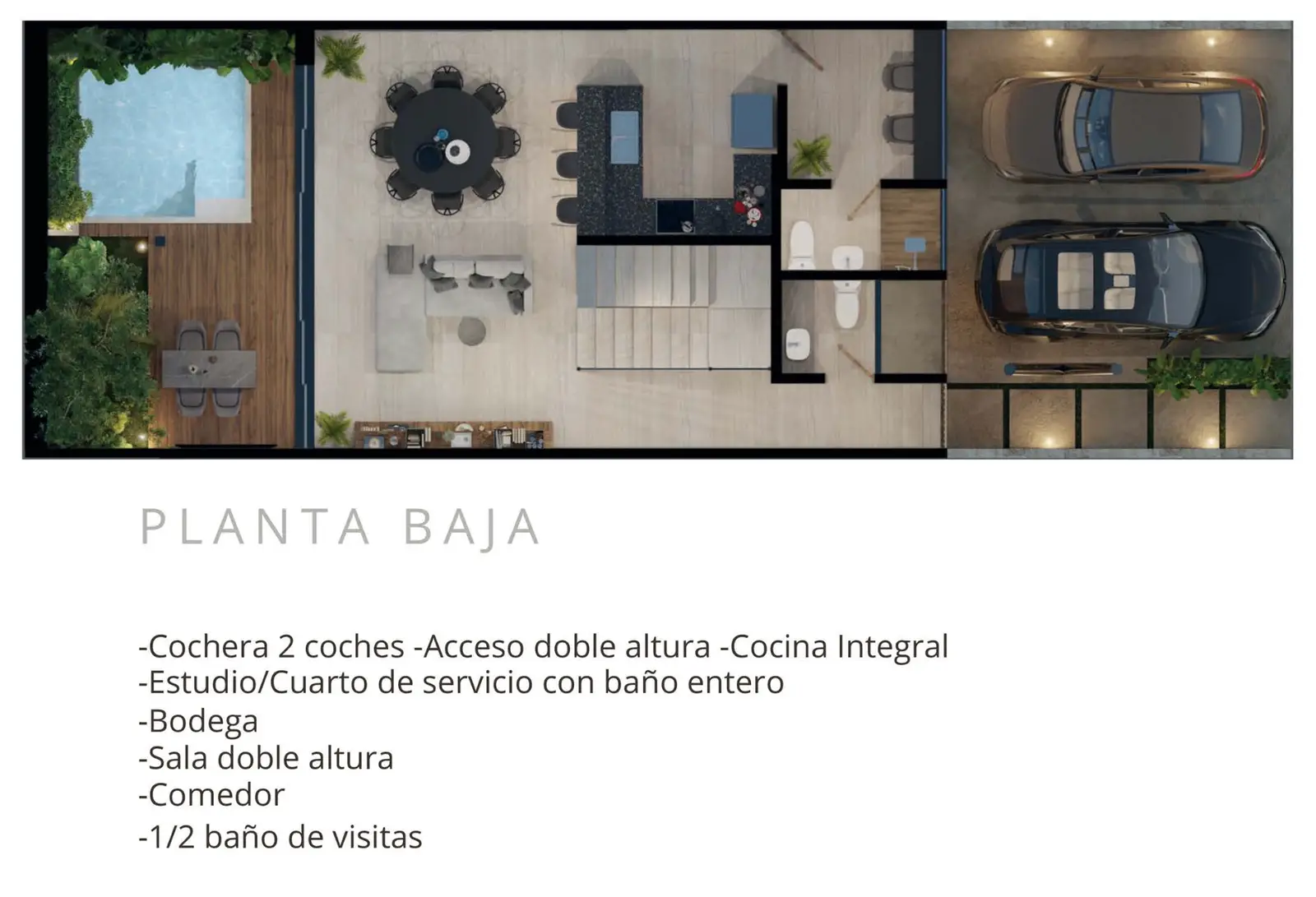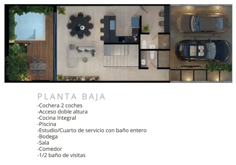 - Distribución: doble altura en acceso y sala, comedor con vista al jardín, cocina equipada, recámara principal con walking closet y baño completo, recámara secundaria con baño propio, área de lavado, cuarto de servicio o estudio con baño completo, piscina y terraza social.