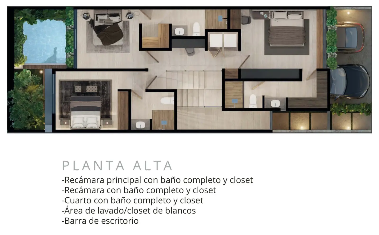 - Distribución: sala-comedor con doble altura, cocina equipada, terraza, área de lavado, estudio o cuarto de servicio con baño completo, jardín posterior y estacionamiento techado para dos autos.